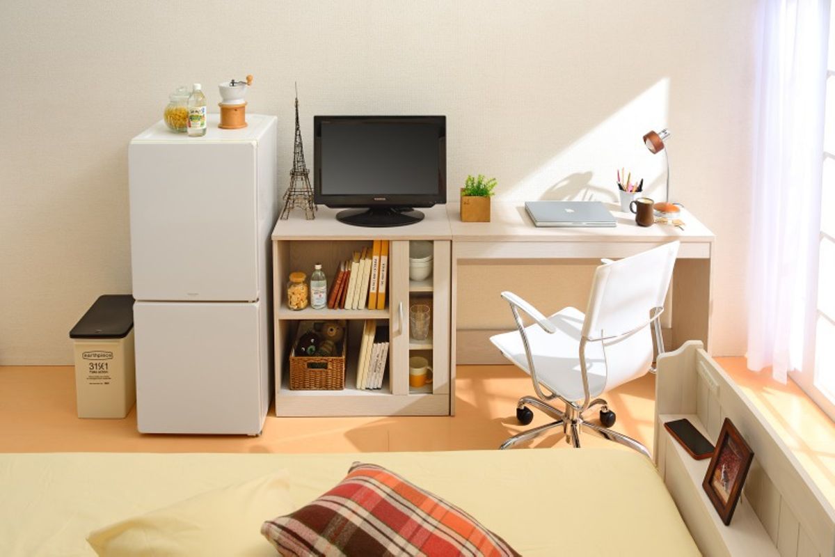 室内にはベット、デスク、チェスト、チェア、テレビ台、エアコン、照明、冷蔵庫、洗濯機などの生活アイテムが標準装備されています。